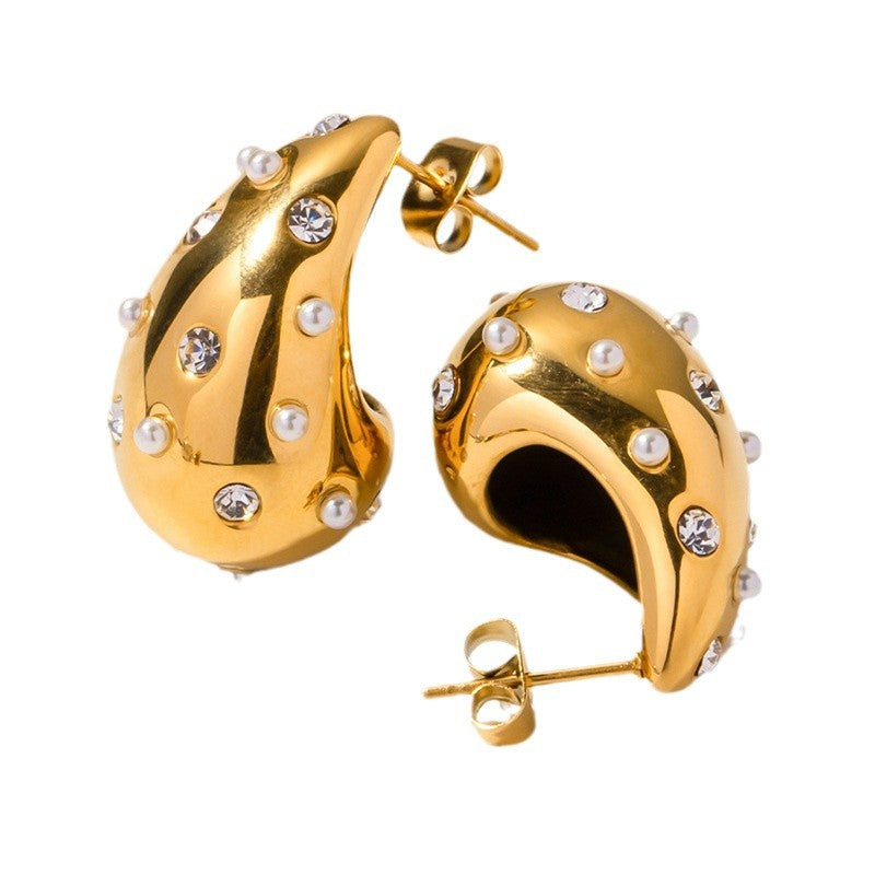 Titanium Steel Cast Diamond Pearl Water Drop Earrings INS Women’s Fashion Versatile Earrings Chubby