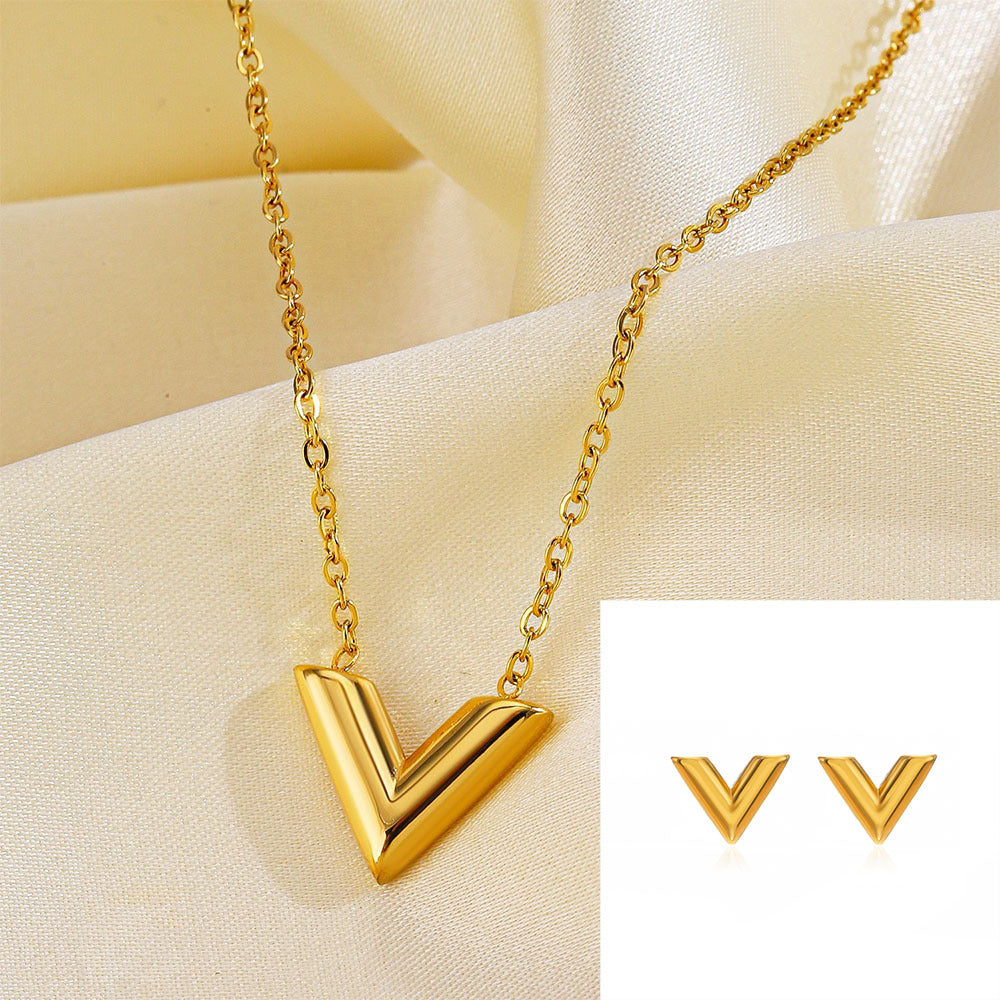 Simple Gold niche V letter necklace women’s summer earrings bracelet three-piece set